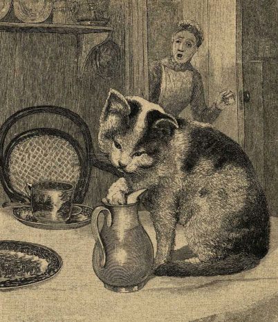 В один миг Котофеич очутился у кувшина со сливками, который стоял на столе в столовой, и уже засунул лапу; но не успел он еще попробовать сливок, как в комнату вбежала кухарка. Котофеич испугался, хотел было бежать, при этом задел хвостом за тарелку, которая упала на пол и разбилась вдребезги.