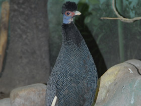 Представители семейства Цесарковые (Numididae) обитают в Африке и на Мадагаскаре. Размер цесарковых составляет от 40 до 70 см. У них короткий, направленный вниз хвост. В отличие от тела, из-за плотного оперения кажущегося кругловатым, голова и шея у цесарковых большей частью не покрыты перьями. Все виды имеют тёмное оперение, испещрённое мелкими круглыми светлыми пятнами. Держатся цесарки стадами в гористых местностях, покрытых густым кустарником и мелким лесом, чередующимся с небольшими открытыми прогалинами.