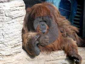 Название “оранг-утан” в переводе с малайского означает “лесной человек”. Орангутан (Pongo) - одна из самых крупных обезьян (вес самца орангутана может достигать 100 кг, длина тела - до 150 см, размах рук - до 2,25 м). Самки значительно мельче - их вес всего 40-50 кг. Сложение у “лесных людей” довольно неуклюжее: передние конечности сильно удлинены, ноги относительно короткие, большой живот. Кисти и стопы этих приматов прекрасно приспособлены к жизни на деревьях - 4 пальца кисти схватывают ветви, подобно мощному крюку. Головной мозг у орангутанов большой, достигает 300-500 куб. см и по строению очень похож на человеческий.